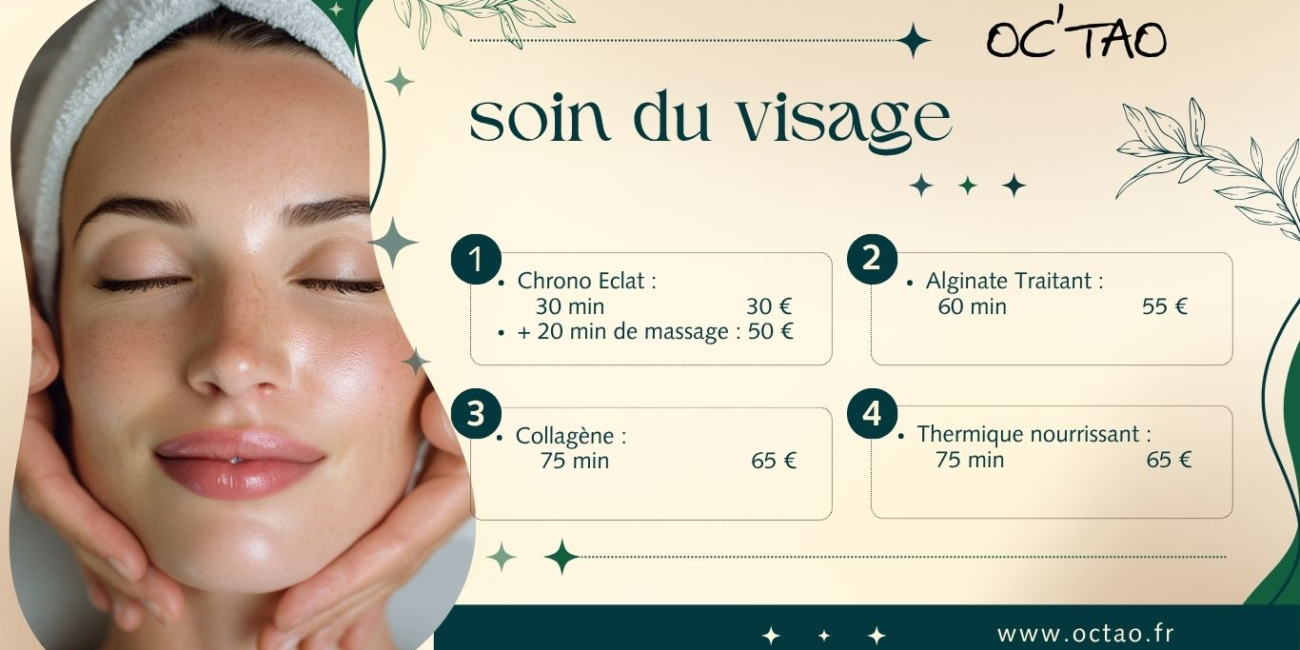 Les soins complets inclus un nettoyage de la peau, un gommage adapté, le massage du visage, des épaules et de la nuque.